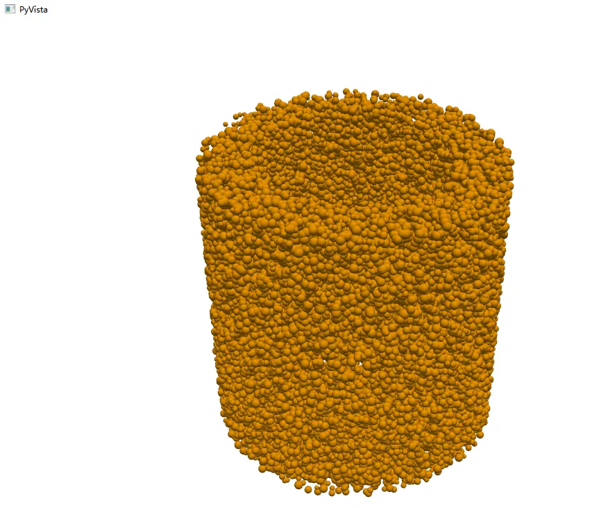 #球体可视化vtk输出函数,利用pyvista简化import numpy as npimport pyvista as pvimport itasca as itdefWrite_VTK(filename, bin = False):''' filename: string, 文件名 bin: Boolean 控制是否写入二进制文件,False写入Asic II '''# 获取球体数据 points = it.ballarray.pos() balls = pv.PolyData(points) balls["radius"] = it.ballarray.radius() balls["displacement"] = it.ballarray.disp() balls["velocity"] = it.ballarray.vel() balls["ids"] = it.ballarray.ids() balls.save(f"balls_{filename}.vtk", binary=bin) print(f"VTK saved: {filename}.vtk") import itasca as itimport Write_VTKimport pyvista as pvit.command('model rest "calm.sav"')Write_VTK('test')# 可视化import pyvista as pvimport numpy as npmesh = pv.read("test.vtk")# 创建一个单位球作为 glyph 的模板sphere = pv.Sphere(radius=1.0, theta_resolution=16, phi_resolution=16)# 用 glyph 按 radius 缩放glyphs = mesh.glyph( geom=sphere, scale="radius", # 使用 point_data 中的 radius orient=False, # 不需要方向就关掉)plotter = pv.Plotter()plotter.add_mesh( glyphs, color="orange", show_edges=False,)plotter.show()最终可以得到类似的图