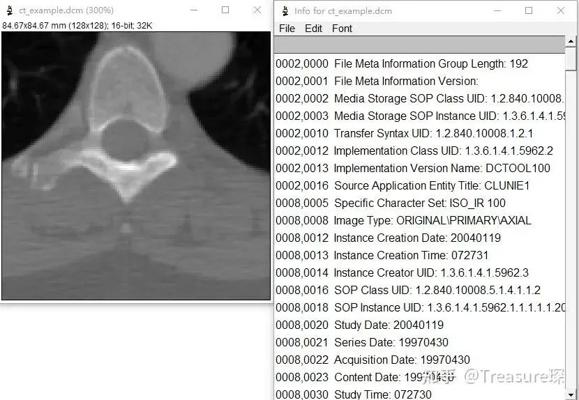 把DICOM读取成为data structure后,可以通过名称或者tag number,对元数据进行读取: