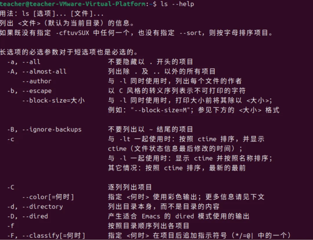 下图通过执行ls --help命令,系统列出了ls命令的用法及相关参数。因此本课仅是简单介绍命令的使用方法,让大家知道什么情况下需要使用这些命令,关于命令的详细用法还需要查看命令的帮助文档。