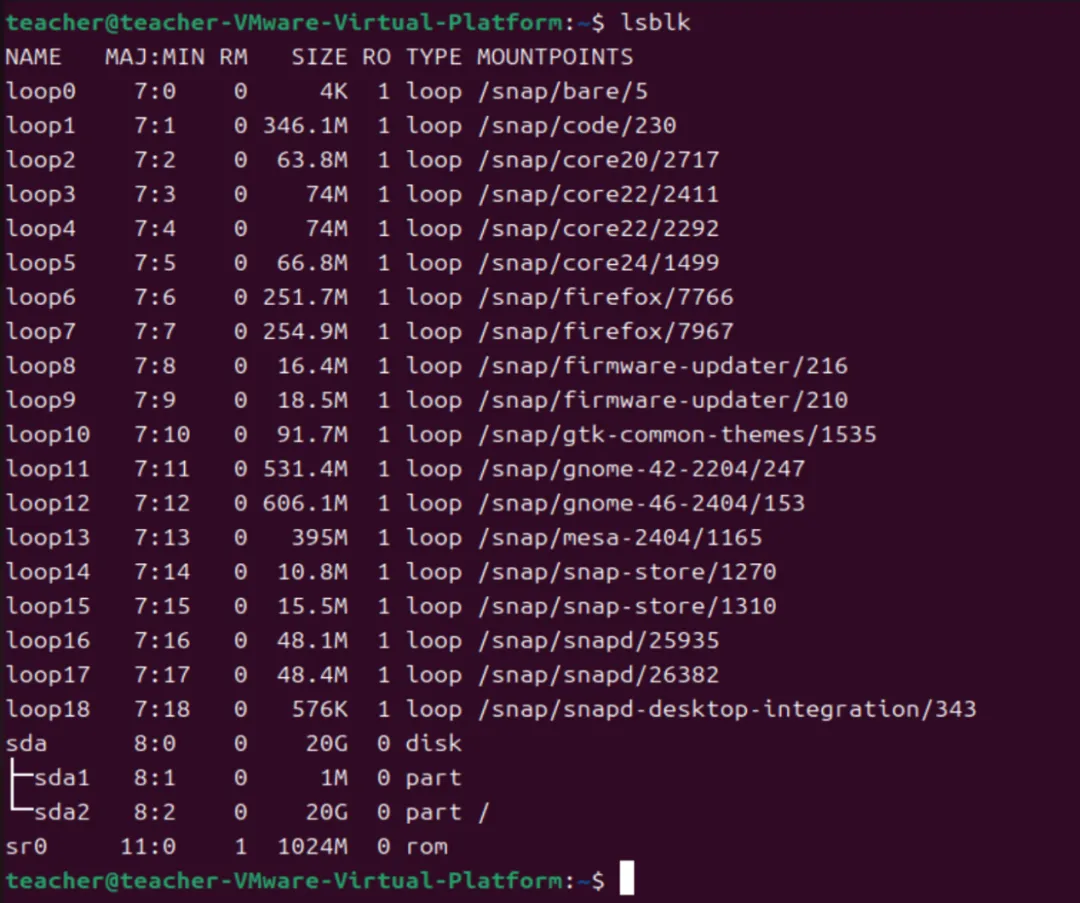 设备sda下面有两个分区:sda1是磁盘的第1个分区,分区空间为1M,是系统的 BIOS Boot 分区;sda2是磁盘的第2个分区,分区空间为20G,几乎占用了磁盘全部空间,该分区挂载到系统根目录, 是Ubuntu 系统的根分区,系统、用户数据都存放在这里。