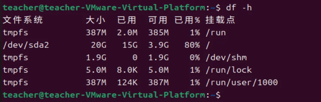 /dev/sda2是磁盘的第2个分区,对应之前 lsblk命令里的 sda2 设备,大小为20G,已用15G,可用还剩余3.9G,空间使用率80%, 已经达到Linux系统预警阈值,Linux 系统通常建议根分区使用率不超过 80%,避免系统因空间不足崩溃。挂载点为系统根目录。