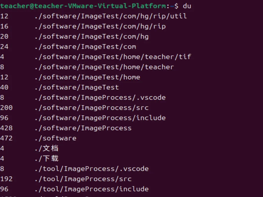 du命令主要用来统计目录或文件占用磁盘工具的大小。当du命令无附加参数时,会递归遍历当前所有子目录,逐个显示每个子文件夹占用的磁盘空间大小(单位为字节),最后叠加统计,一层一层汇总。命令执行结果如下图所示.