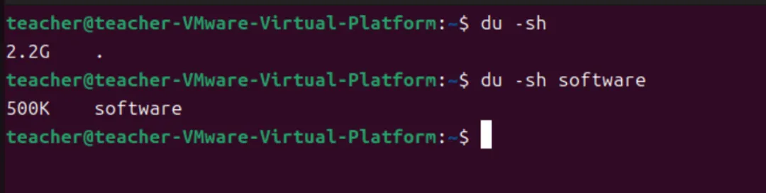 上图的第一个命令显示根目录占用的磁盘空间为2.2G,第二个命令显示根目录下的software目录占用的磁盘空间为500K。这两条命令都没有显示子文件夹细节,而是对子文件夹占用的磁盘空间进行了汇总。