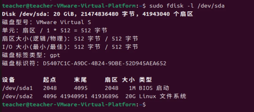 上图显示/dev/sda是虚拟机里的第一块虚拟硬盘,硬盘容量是20GB,每个扇区大小是 512 字节,磁盘用的是GPT分区表。