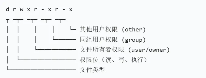 第8~10位:r-x其他用户权限。r:可读;-:不可写;x:可进入。