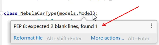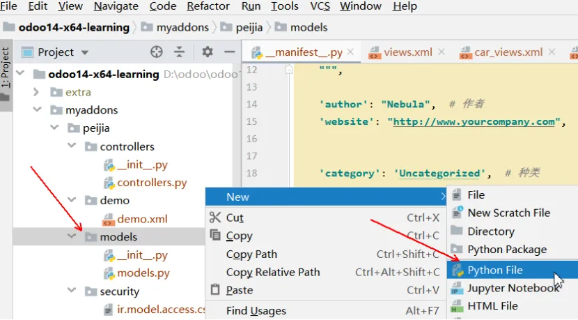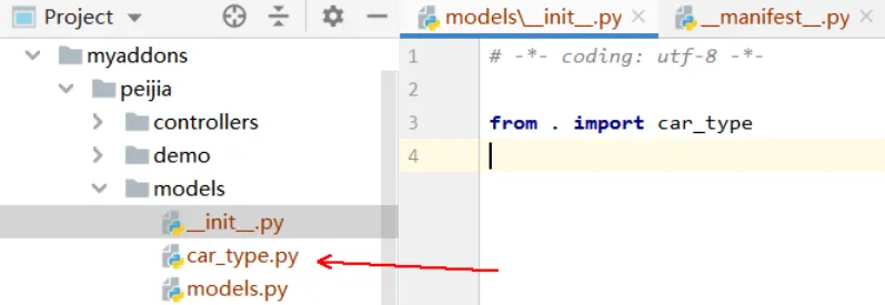 在左侧列表myaddons->peijia->models上点击鼠标右键,选择new->Python File。在弹出的对话框输入文件名car_type,点击Python file,PyCharm在指定的目录自动生成文件并打开。# -*- coding: utf-8 -*-# &&&&&&&&&&&&&&&&&&&&&&&&&&&&&&&&&&&&&&&&&&&&&&&&&&&&&&&&&&&&&&&&&&&# NebulaERP odoo14.0# QQ:50282# 邮件:50282@qq.com# 手机:1111111111# 作者:'Nebula'# 公司网址: www.erpSoft.org# Copyright 2012-2020 Nebula# 日期:2020/3/25# &&&&&&&&&&&&&&&&&&&&&&&&&&&&&&&&&&&&&&&&&&&&&&&&&&&&&&&&&&&&&&&&&&&from odoo import fields, modelsclass NebulaCarType(models.Model): _name = "nebula.car.type" _description = "车辆类型" _order = 'name' name = fields.Char(string='类型编号', size=2, required=True, copy=False, index=True) name_type = fields.Char(string='类型名称') active = fields.Boolean(default=True, string='是否启用', size=2) first_maintain = fields.Integer(string='首保公里数', size=8, default=3500) every_maintain = fields.Integer(string='日常保养公里数', size=8, default=7500) note = fields.Text('备注') # 数据库层面的约束,所以效率比较高 _sql_constraints = [('check_uniq_name', 'unique(name)', '不允许同类型编号'), ('check_uniq_type', 'unique(name_type)', '不允许同类型编号') ]