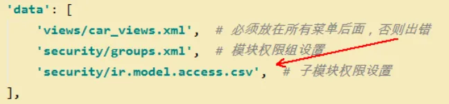 请注意顺序,ir.model.access.csv调用了groups.xml定义的权限组名,基于先声明再使用的原则,所以顺序不能错。