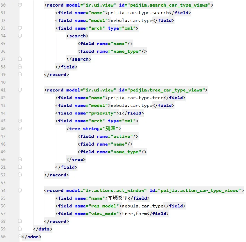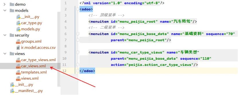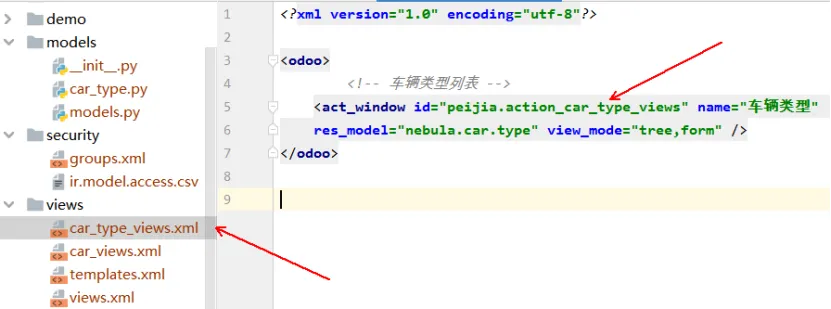 在views目录新建car_type_views.xml文件,内容如下:<?xml version="1.0" encoding="utf-8"?><odoo> <!-- 车辆类型列表 --> <act_windowid="peijia.action_car_type_views"name="车辆类型" res_model="nebula.car.type" view_mode="tree,form" /></odoo>