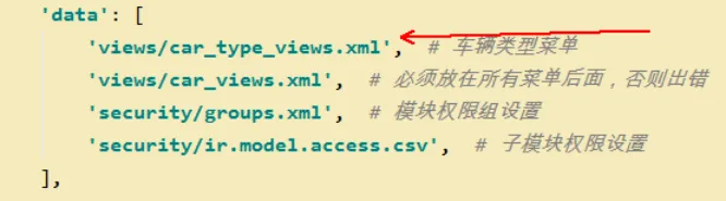 这里可以看到act_windows id的值和添加菜单项action的值相同。这里odoo会自动按照默认视图模版显示。在__manifest__.py文件中,data段的views/car_views.xml前面添加‘views/car_type_views.xml',引入视图文件。添加菜单项