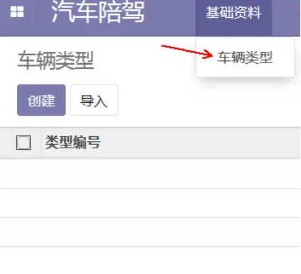 在models目录下新增car_type.py文件,里面有数据模型定义 在models目录下的__init__.py文件中,添加对car_type文件的引用 检查项目目录下的__init__.py文件有对models目录的引用 修改security目录ir.model.access.csv文件,将该数据模型赋权限给陪驾管理组 检查项目目录下的__manifest__.py文件中data段有对ir.model.access.csv文件的引用 在views目录下新增car_type_views.xml文件,定义一个最基础的界面 在项目目录下的__manifest__.py文件中data段添加对car_type_views.xml的引用 在views目录下car_views.xml文件中新增对车辆类型的相关菜单信息完善界面