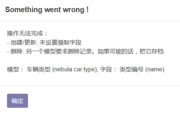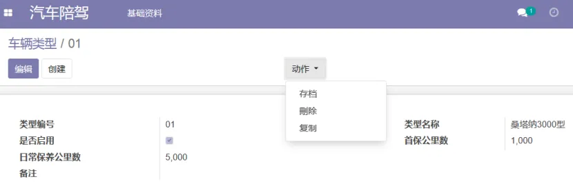 升级完成后,点击左上角图标,点击汽车陪驾,进入汽车陪驾模块。因目前只有汽车类型模块,且之前已经设置管理员有该模块的权限,所以ODOO会直接进入该模块。我们点击创建按钮,在默认的录入界面输入第一个车辆类型。点击保存后,显示单条记录,我们可以点击编辑按钮编辑该条记录,或点击创建按钮创建新的车辆类型,也可以点击动作菜单展开更多操作。存档:设置字段active为是,反之为取消存档,设置字段active为否,我们之前已经设置active在汽车类型中作为“是否启用”标识,所以存档操作影响是否启用字段值。关于复制:复制的时候,会以当前记录为蓝本,后台新建一条记录,再检查这条记录是不是符合条件,符合条件,就保存到数据库中,否则会提示错误信息。该子模块name字段设置为不可复制,且必填,所以提示name在复制的时候不能完成。解决方法可以设置一个默认值,每次复制后记得修改该默认值。当我们新建的时候,如果类型编号或类型名称和数据库中记录重复的时候,也会提示错误。class NebulaCarType(models.Model): _name = "nebula.car.type" _description = "车辆类型" _order = 'name' name = fields.Char(string='类型编号', size=2, required=True, copy=False, index=True, default='99') name_type = fields.Char(string='类型名称', required=True, copy=False, default='待修改') active = fields.Boolean(default=True, string='是否启用', size=2) first_maintain = fields.Integer(string='首保公里数', size=8, default=3500) every_maintain = fields.Integer(string='日常保养公里数', size=8, default=7500) note = fields.Text('备注') # 数据库层面的约束,所以效率比较高 _sql_constraints = [('check_uniq_name', 'unique(name)', '不允许同类型编号'), ('check_uniq_type', 'unique(name_type)', '不允许同类型名称') ]
