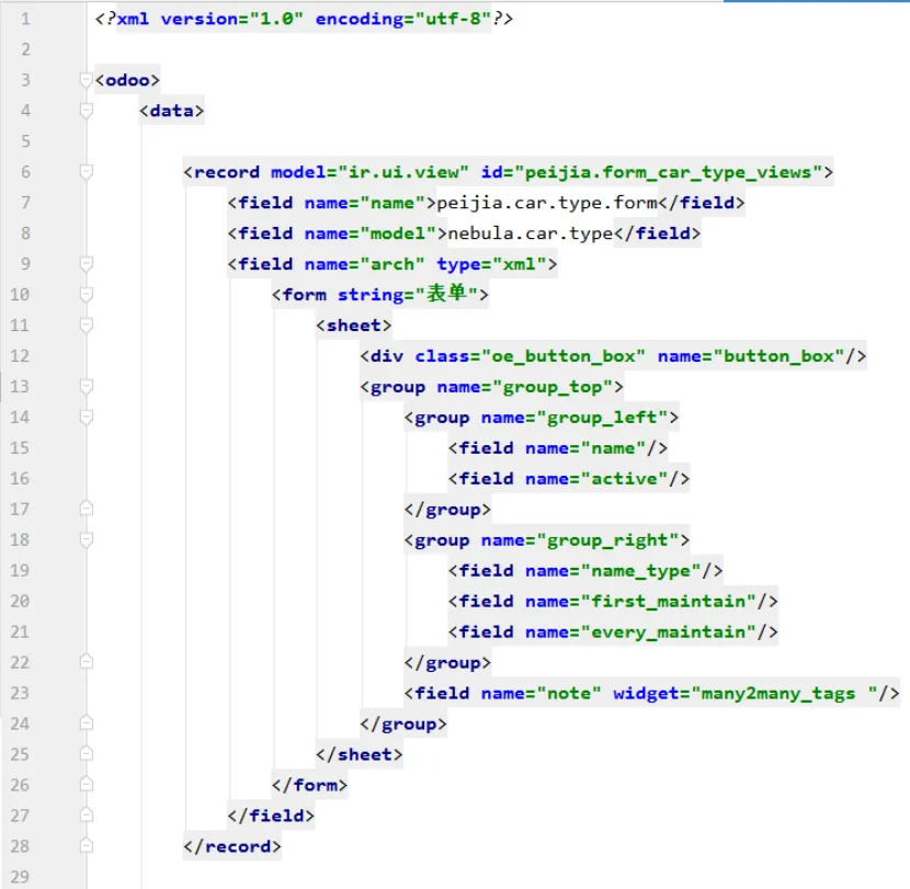 <recordmodel="ir.ui.view"id="peijia.form_car_type_views"> <fieldname="name">peijia.car.type.form</field> <fieldname="model">nebula.car.type</field> <fieldname="arch"type="xml"> <formstring="表单"> <sheet> <divclass="oe_button_box"name="button_box"/> <groupname="group_top"> <groupname="group_left"> <fieldname="name"/> <fieldname="active"/> </group> <groupname="group_right"> <fieldname="name_type"/> <fieldname="first_maintain"/> <fieldname="every_maintain"/> </group> <fieldname="note"widget="many2many_tags"/> </group> </sheet> </form> </field></record>
