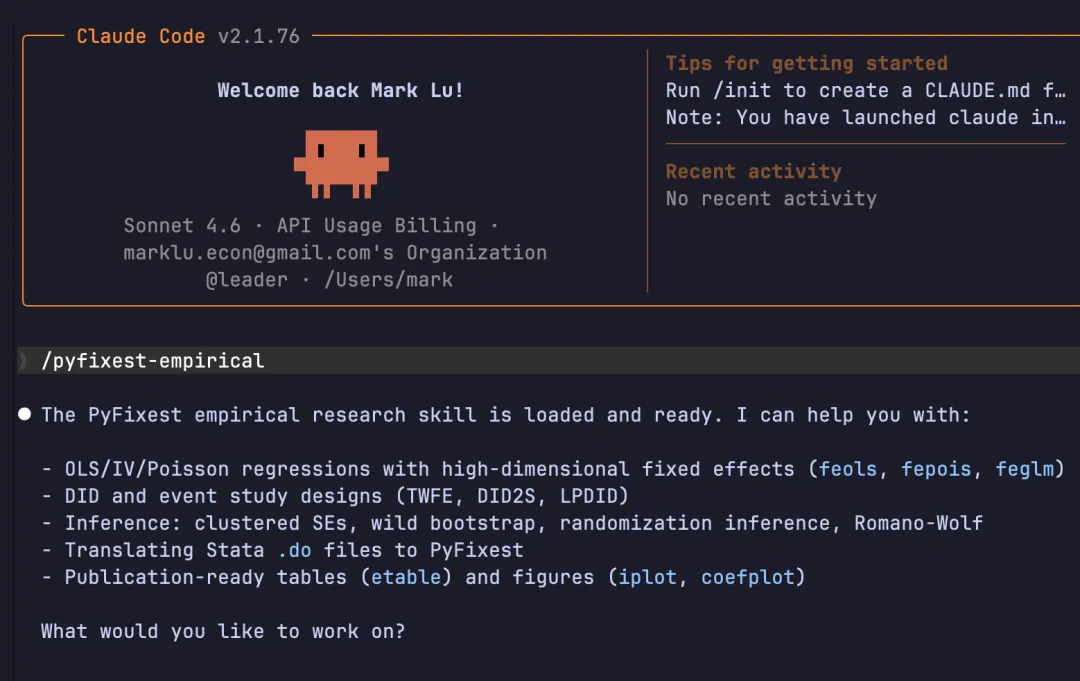 git clone https://github.com/luzhiyu-econ/pyfixest-empirical ~/.claude/skills/pyfixest-empiricalcd ~/.claude/skills/pyfixest-empirical./install.sh重启 Claude Code 后生效。之后每次涉及 PyFixest 相关任务,skill 会自动触发