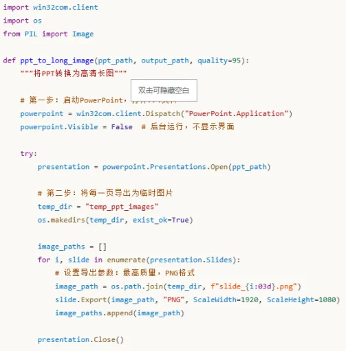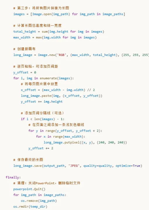 这个脚本的核心逻辑分为三步:通过COM接口控制PowerPoint导出每一页为高清图片;将所有图片加载到内存;计算合适的尺寸并进行拼接。你可以根据需要调整图片质量、输出格式和页面间距。