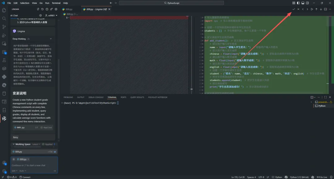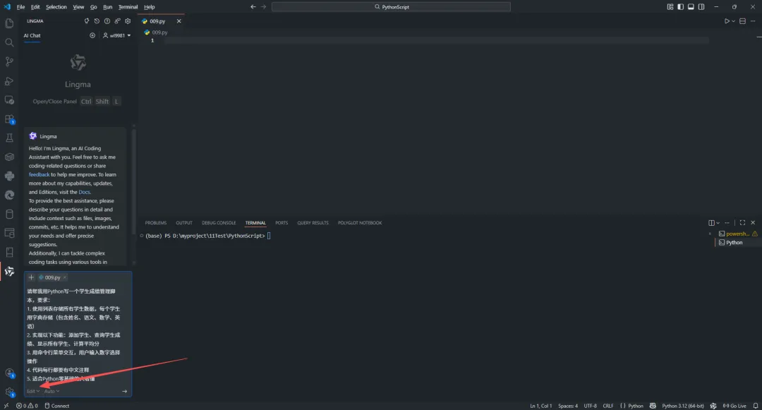 通义灵码会生成完整代码,点击代码块右上角的"插入到编辑器"按钮,代码就自动出现在你的 009.py 文件里了!