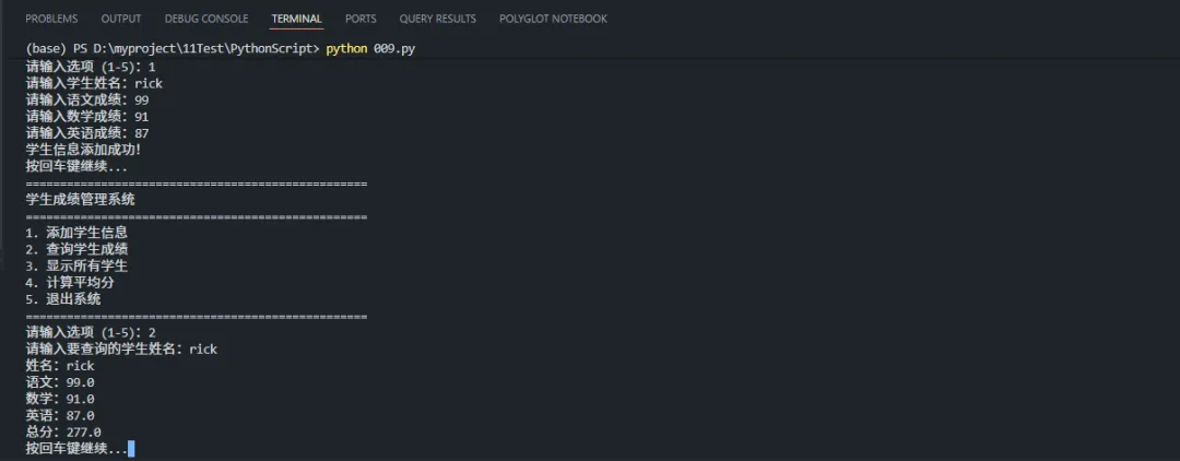 第三件:跑起来了一个真实可用的成绩管理脚本——以后再也不用手动翻Excel找成绩了,输个名字3秒出结果!