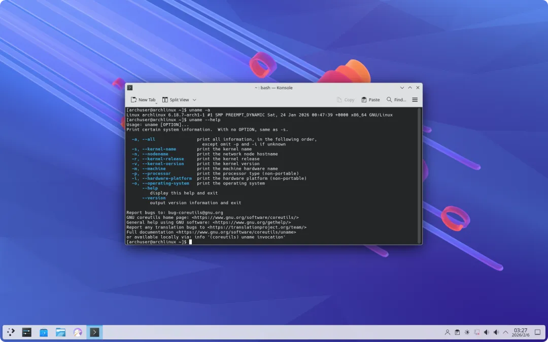 uname -aLinux df1-ws-5084 4.4.0-64-generic #85-Ubuntu SMP Mon Feb 20 11:50:30 UTC 2017 x86_64 x86_64 x86_64 GNU/Linux用法:`uname [OPTION]...`打印特定的系统信息。没有选项时,等同于 `-s`。`-a`, `--all` - 按以下顺序打印所有信息,如果未知则省略 `-p` 和 `-i`:- `-s`, `--kernel-name` - 打印内核名称- `-n`, `--nodename` - 打印网络节点主机名- `-r`, `--kernel-release` - 打印内核发行版本- `-v`, `--kernel-version` - 打印内核版本- `-m`, `--machine` - 打印机器硬件名称- `-p`, `--processor` - 打印处理器类型(非可移植)- `-i`, `--hardware-platform` - 打印硬件平台(非可移植)- `-o`, `--operating-system` - 打印操作系统- `--help` - 显示帮助信息并退出- `--version` - 输出版本信息并退出