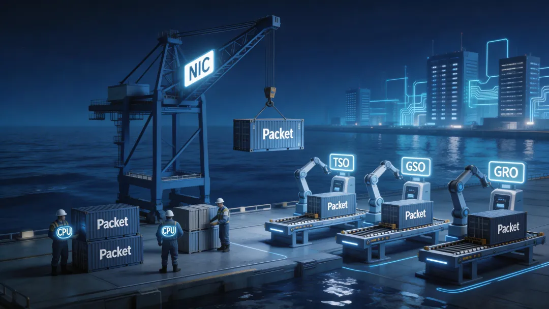 把 Linux 网络栈想象成一座繁忙的港口:包是集装箱,CPU 是码头工人,网卡是起重机。那些三字母缩写,就是港口里的自动化设备——有的负责分包,有的负责合包,有的调度 CPU,有的减少中断。把它们搞清楚,80% 的网络性能问题就有了定位方向。