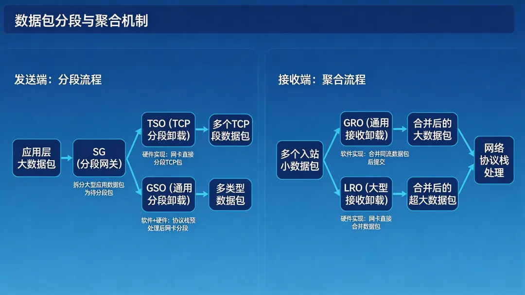 - 分段 / 聚合: TSO · GSO · GRO · LRO · SG