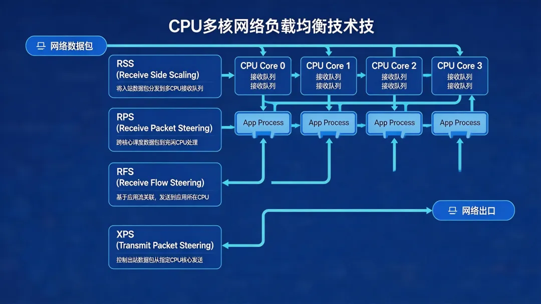 NIC 收到入包 → 按(源IP、目标IP、源端口、目标端口)计算哈希→ 分发到不同 RX 队列 → 各队列由独立 CPU 处理