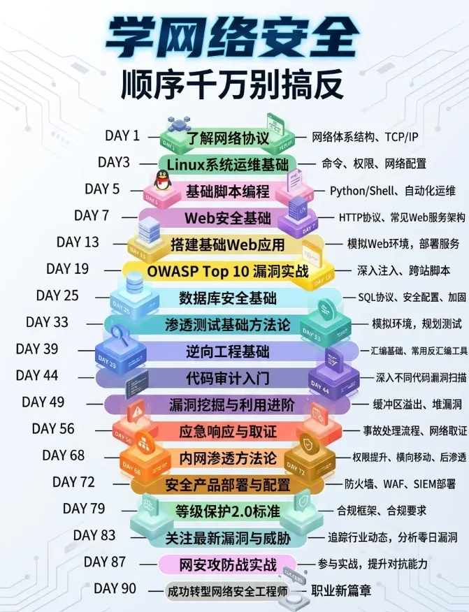 第1天 了解网络协议:吃透网络体系结构、TCP/IP,所有网安知识的根第3天 Linux 系统运维基础:命令、权限、网络配置,攻防全靠 Linux 吃饭 第5天 基础脚本编程:Python/Shell,自动化运维必备,效率直接拉满 第7天 Web 安全基础:HTTP 协议、常见 Web 服务架构,Web 渗透的敲门砖