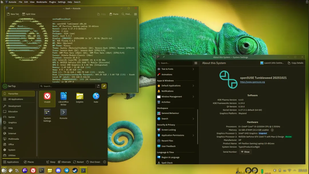 openSUSE 是 Linux 老牌发行版,历史可追溯到 1994 年的 SUSE。它提供稳定版的 Leap 和滚动更新的 Tumbleweed,满足不同需求。曾经标志性的 YaST 管理工具在 Leap 16 中图形版已弃用,但文本版仍在,系统转向标准 Cockpit 工具,管理依旧便捷。