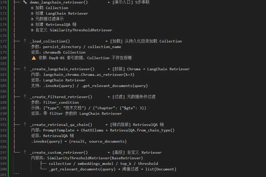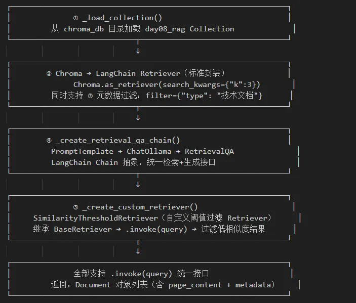def _build_chroma_retriever(collection, embeddings_model: str = "nomic-embed-text", top_k: int = 3):"""将原生 chromadb.Collection 封装为 LangChain Retriever。Pydantic v2 规范(踩坑总结):1. 类级别必须声明所有字段(collection: object,top_k: int = 3)2. super().__init__() 必须传入所有声明的字段3. 可选字段用 dict | None = None,禁止 dict = None参数:collection:原生 chromadb.Collection(Day8-01 写入的数据)embeddings_model:Ollama 嵌入模型名称top_k:返回的文档数量返回:实现了 .invoke(query) 方法的 ChromaRetriever 实例"""from langchain_core.documents import Documentfrom langchain_core.retrievers import BaseRetrieverfrom langchain_ollama import OllamaEmbeddingsclass ChromaRetriever(BaseRetriever):"""直接包装原生 chromadb.Collection 的 LangChain Retriever。继承 langchain_core.retrievers.BaseRetriever(Pydantic v2)。必须实现:_get_relevant_documents(query: str) -> list[Document]"""# ── Pydantic v2:类级别声明所有字段 ─────────────────────collection: object # 原生 chromadb.Collectionembeddings_model: str # Ollama 嵌入模型名称top_k: int = 3 # 返回的文档数量def _get_relevant_documents(self, query: str) -> list[Document]:"""核心方法:根据 query 获取相关文档。流程:1. embed_query(query) → 向量2. collection.query() → Chroma 检索3. 组装 list[Document] 返回"""# embeddings 在方法内实例化,不作为 Pydantic 字段embeddings = OllamaEmbeddings(model=self.embeddings_model)query_vector = embeddings.embed_query(query)# Chroma 原生查询results = self.collection.query(query_embeddings=[query_vector],n_results=self.top_k,include=["documents", "metadatas", "distances"],)# 组装 Document 列表docs = []raw_docs = results.get("documents", [[]])[0]raw_metas = (results.get("metadatas") or [[]])[0]raw_dists = (results.get("distances") or [[]])[0]for i, content in enumerate(raw_docs):meta = raw_metas[i] if i < len(raw_metas) else {}meta["distance"] = raw_dists[i] if i < len(raw_dists) else Nonedocs.append(Document(page_content=content, metadata=meta))return docsreturn ChromaRetriever(collection=collection,embeddings_model=embeddings_model,top_k=top_k,)