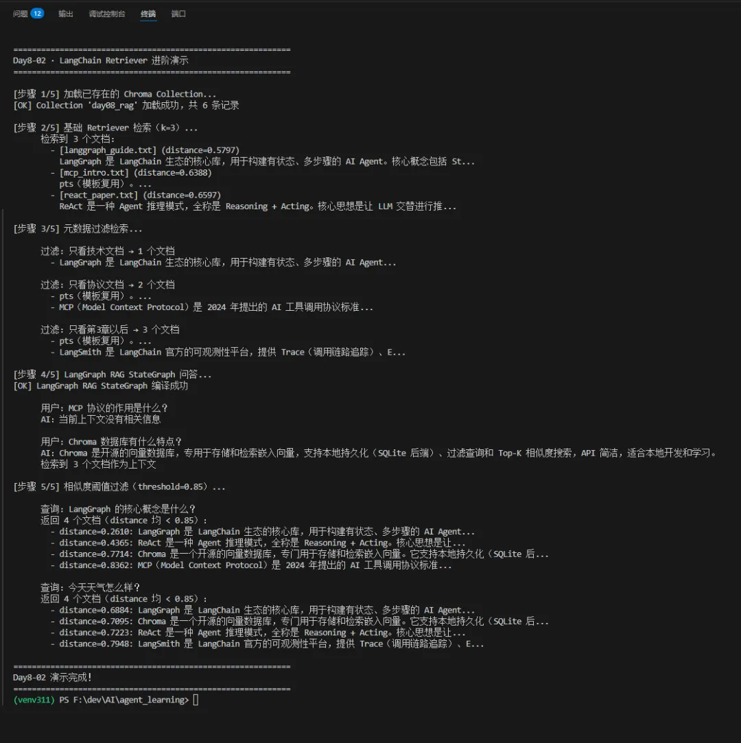 def demo():"""演示 LangChain Retriever 进阶用法:1. 加载已存在 Collection2. 基础 Retriever 检索3. 元数据过滤检索4. LangGraph RAG StateGraph 问答(替代已废弃的 RetrievalQA)5. 相似度阈值过滤"""print("\n" + "=" * 60)print("Day8-02 · LangChain Retriever 进阶演示")print("=" * 60)persist_dir = str(_SCRIPT_DIR / "chroma_db")# ── 步骤 1:加载 Collection ────────────────────────────────print("\n[步骤 1/5] 加载已存在的 Chroma Collection...")try:collection = _load_collection(persist_dir)except Exception as e:print(f"[错误] 无法加载 Collection:{e}")print(" 请先运行 Day8-01 完成索引:python 01_rag_basics.py")return# ── 步骤 2:基础 Retriever ────────────────────────────────print("\n[步骤 2/5] 基础 Retriever 检索(k=3)...")retriever = _build_chroma_retriever(collection, top_k=3)docs = retriever.invoke("LangGraph 是什么?")print(f" 检索到 {len(docs)} 个文档:")for d in docs:src = d.metadata.get("source", "?")dist = d.metadata.get("distance")dist_str = f"{dist:.4f}" if dist is not None else "?"print(f" - [{src}] (distance={dist_str})")print(f" {d.page_content[:60]}...")# ── 步骤 3:元数据过滤 ────────────────────────────────────print("\n[步骤 3/5] 元数据过滤检索...")filter_tests = [("只看技术文档", {"type": "技术文档"}),("只看协议文档", {"type": "协议文档"}),("只看第3章以后", {"chapter": {"$gte": 3}}),]for name, condition in filter_tests:filtered = _build_filtered_retriever(collection, condition)docs = filtered.invoke("LangGraph 是什么?")print(f"\n 过滤:{name} → {len(docs)} 个文档")for d in docs[:2]:print(f" - {d.page_content[:50]}...")# ── 步骤 4:LangGraph RAG ────────────────────────────────print("\n[步骤 4/5] LangGraph RAG StateGraph 问答...")rag_graph = _build_langgraph_rag_chain(retriever)for q in ["MCP 协议的作用是什么?", "Chroma 数据库有什么特点?"]:print(f"\n 用户:{q}")result = rag_graph.invoke({"question": q})print(f" AI:{result['answer'].strip()}")print(f" 检索到 {len(result['context'])} 个文档作为上下文")# ── 步骤 5:相似度阈值过滤 ───────────────────────────────print("\n[步骤 5/5] 相似度阈值过滤(threshold=0.85)...")threshold_retriever = _build_threshold_retriever(collection, threshold=0.85)for q in ["LangGraph 的核心概念是什么?", "今天天气怎么样?"]:docs = threshold_retriever.invoke(q)print(f"\n 查询:{q}")if docs:print(f" 返回 {len(docs)} 个文档(distance 均 < 0.85):")for d in docs:dist = d.metadata.get("distance")print(f" - distance={dist:.4f}: {d.page_content[:50]}...")else:print(f" 无相关结果(所有文档 distance >= 0.85)")print("\n" + "=" * 60)print("Day8-02 演示完成!")print("=" * 60)if __name__ == "__main__":demo()