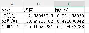 预览结果中,对照组均值约12.58,处理组1约18.49,处理组2约15.15,符合实验设计的差异预期;