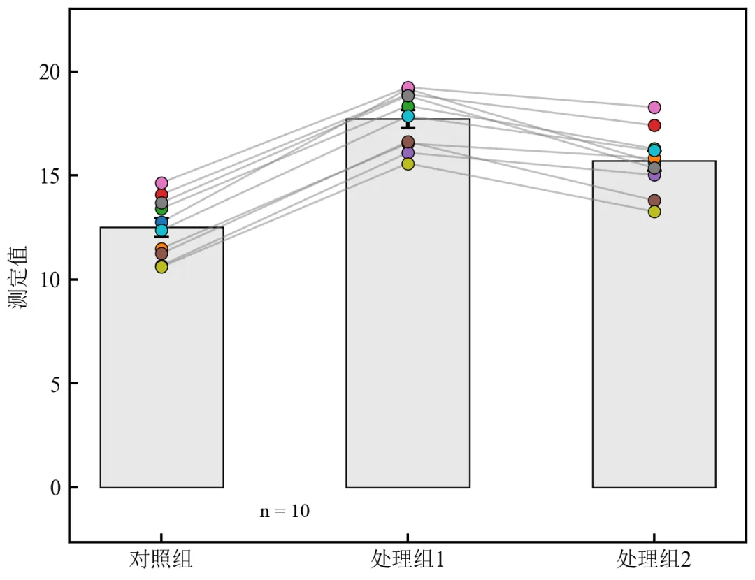 执行结果分析:图中每条灰色连线代表一个受试者在三种处理下的变化轨迹,清晰展示个体响应;散点颜色按受试者区分,便于追踪特定个体,符合《Nature Methods》等期刊常用样式;