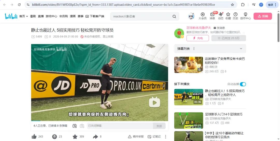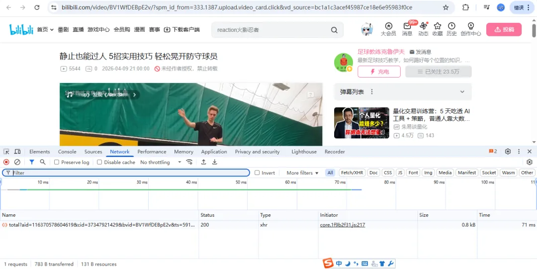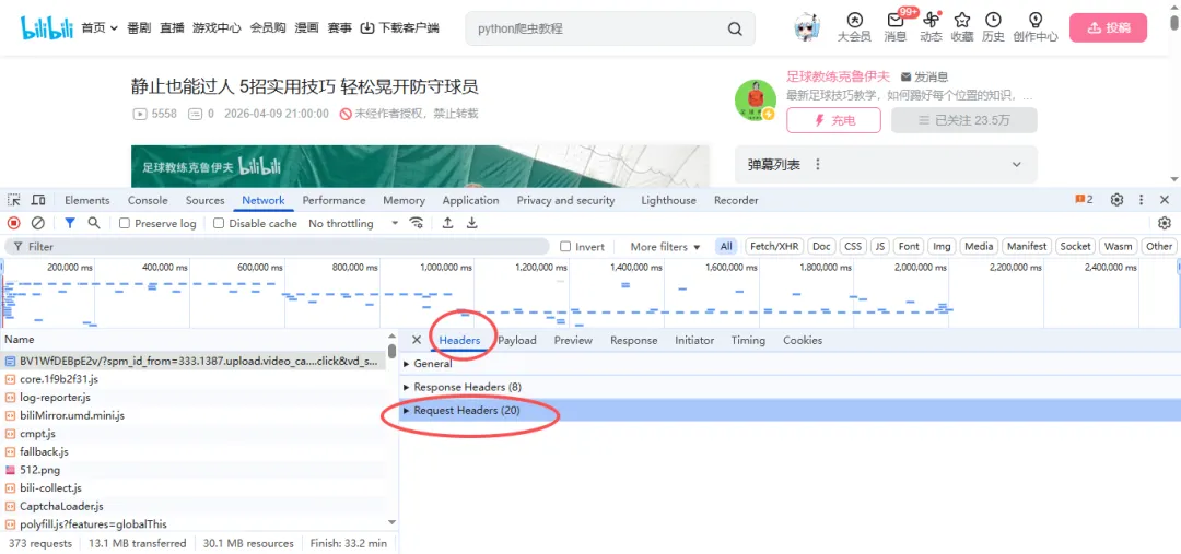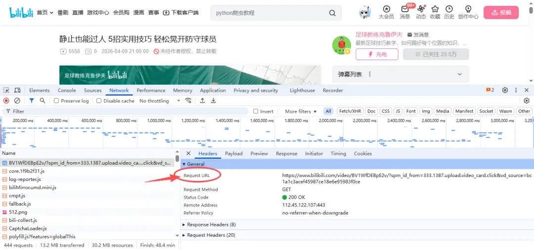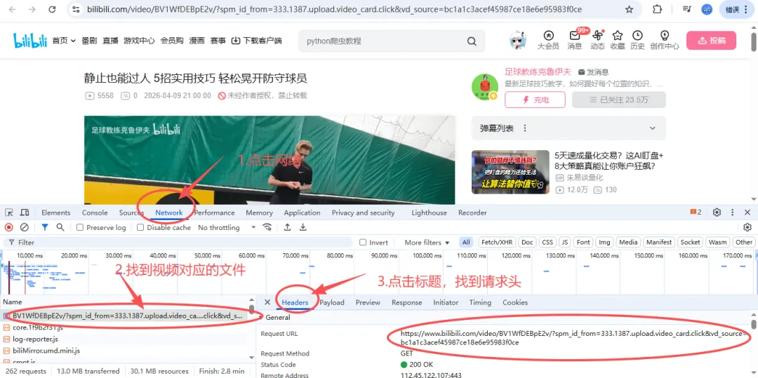 Hello,大家好啊!我是亮娃儿,平时喜欢踢球,就想着能在小破站(B站)多学习些骚气的过人动作,所以就想着把B站的视频爬下来多看几遍。