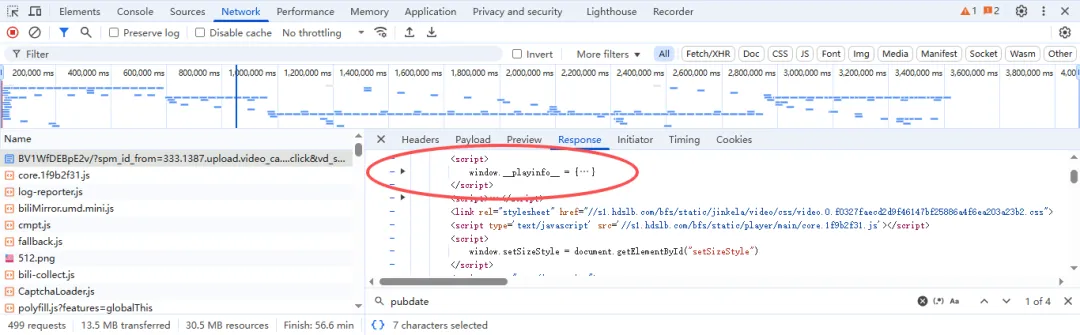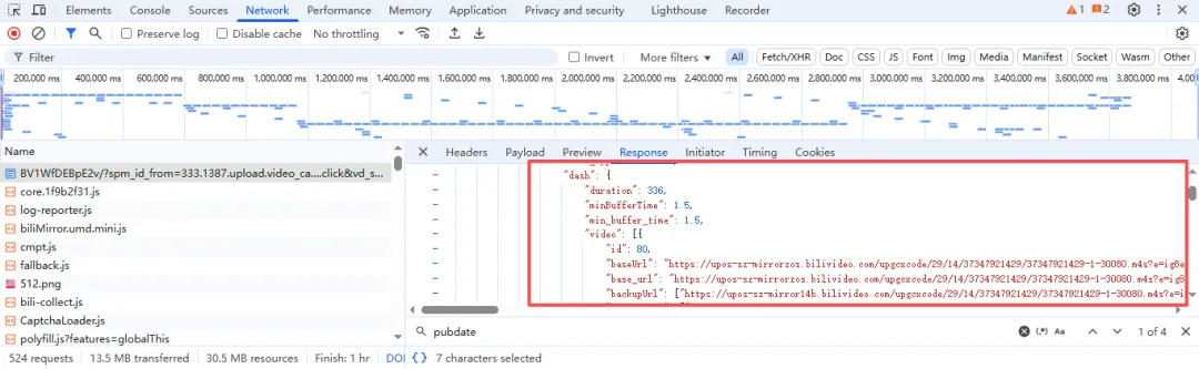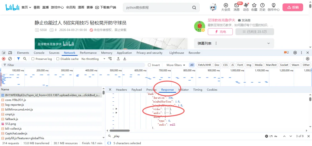 咱们可以继续在 Response(响应)标签下,因为B站的视频比较特殊,一个视频文件分为视频和音频两部分,如图所示为该视频的视频画面和音频内容。