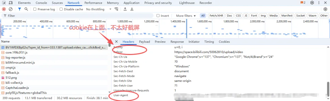 # 导入数据请求模块import requests# 发送请求def get_response(url, params=None): # 模拟浏览器 headers = { # cookie 用户信息,常用于检测是否有登陆账号(登陆与否都有cookie)"cookie": "你自己的cookie号", # referer 防盗链,告诉服务器请求网址从哪里跳转过来的"referer": "https://space.bilibili.com/50062810/upload/video", # user-agent 用户代理,表示浏览器/设备基本身份信息"user-agent": "你自己的浏览器" } # 发送请求 response = requests.get(url=url, params=params, headers=headers)return response那有小伙伴又会问了,cookie 和 useragent 在哪找呢 ❓
