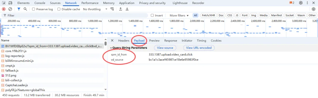 import re# 获取视频信息def get_video_info(): # 播放页面链接 url = "https://www.bilibili.com/video/BV1WfDEBpE2v/" # 构建查询参数 params = {"spm_id_from": "333.1387.upload.video_card.click","vd_source": "bc1a1c3acef45987ce18e6e95983f0ce" } # 调用发送请求函数,获取响应的文本数据 html = get_response(url, params).text # # 提取视频标题 title = re.findall('"title":"(.*?)","pubdate"',html)[0] # 提取信息,json数据格式字符串 info = re.findall('<script>window.__playinfo__=(.*?)</script>', html)[0] # print(info) # 把json字符串转成字典 json_data = json.loads(info) # print(json_data) # 提取视频链接 video_url = json_data['data']['dash']['video'][0]['baseUrl'] # 提取音频链接 audio_url = json_data['data']['dash']['audio'][0]['baseUrl'] print(title) print(video_url) print(audio_url)return title,video_url,audio_url首先,咱们来说一说这串代码的播放链接,就是用的这个请求网址 👇