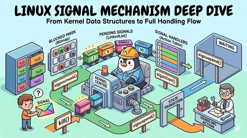 在 Linux 内核中,信号(Signal)是进程间通信(IPC)中最古老、最基本的异步通知机制。不同于文件系统通过 file_struct 管理文件描述符,或网络栈通过 socket 组织数据,信号机制紧密耦合在进程控制块 task_struct 之中,是进程调度和执行流中不可或缺的一部分。