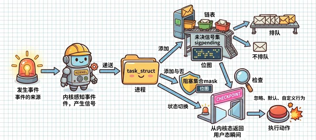kill / raise | 点亮目标进程的 pending 位图,挂载 sigqueue | 产生信号,触发内核检查逻辑 |