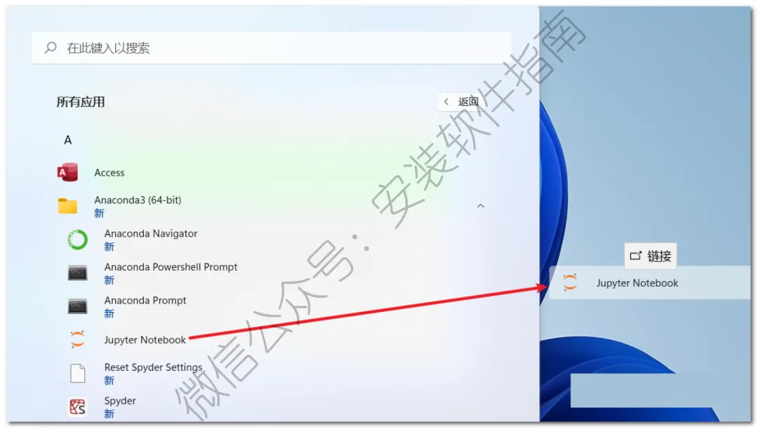 13、打开开始菜单,双击打开【Jupyter Notebook】,如果想查看全部功能和其他用途可以打开【Anaconda Navigator】