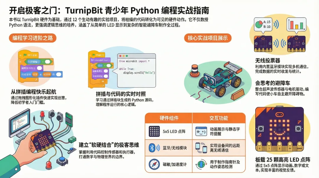 这本书没有一上来就抛复杂概念,而是选了TurnipBit、TPYBoard这些适合青少年的开发板(核心是ARM架构的STM32芯片),门槛直接拉低!它的核心秘诀就是MicroPython固件——给原本“娇气”的单片机,装了一个精简版Python 3运行环境。以前操控硬件要学难懂的C/C++,现在娃用Python,甚至用面向对象的思路,就能直接控制GPIO接口、采集模拟量、实现无线通信,入门难度直接减半!2. 渐进式教学:从“拼积木”到写代码,娃不抵触!