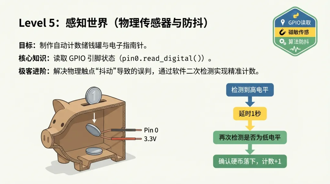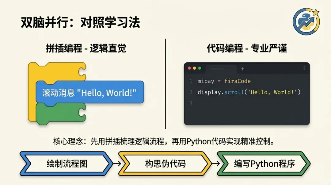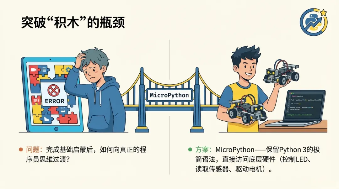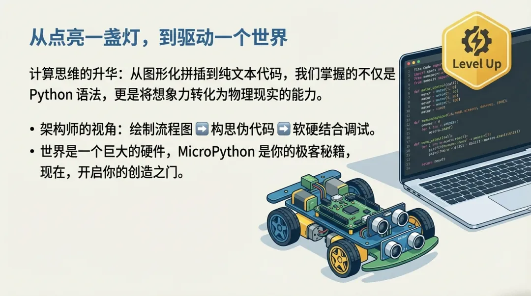 最懂娃的一点,就是它的教学逻辑——不强迫娃直接写代码,而是循序渐进,一步步引导。一开始用Blockly可视化“拼插编程”,就像搭积木一样,让娃先搞定基础逻辑;练熟之后,再无缝过渡到纯Python脚本,衔接自然不生硬。更贴心的是,它还规范了娃的开发习惯:写代码前,先画流程图、写伪代码,把变量、逻辑运算、循环这些核心概念,揉进每一步操作里,不仅学编程,还能培养严谨的思维!3. 实战拉满:传感器+通信协议,吃透物联网基础!