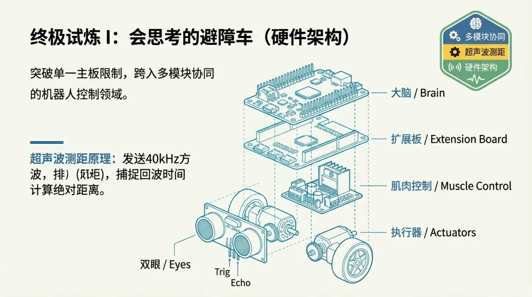 学到最后,娃能亲手搭建“会思考的避障车”,把前面学的知识点全用上,成就感直接拉满!感知层用HC-SR04超声波传感器,通过发射40kHz方波、测量回波时间,精准计算距离;执行层用L298N驱动芯片,控制电机正反转;再加上软件设置安全距离,一个完整的闭环避障系统就做好了——娃能直观看到,自己写的代码,真的能让机器人“思考”起来!这才是青少年编程书该有的样子!