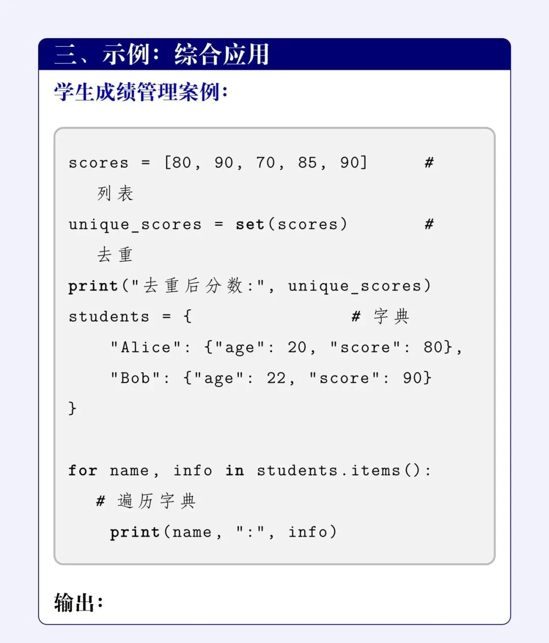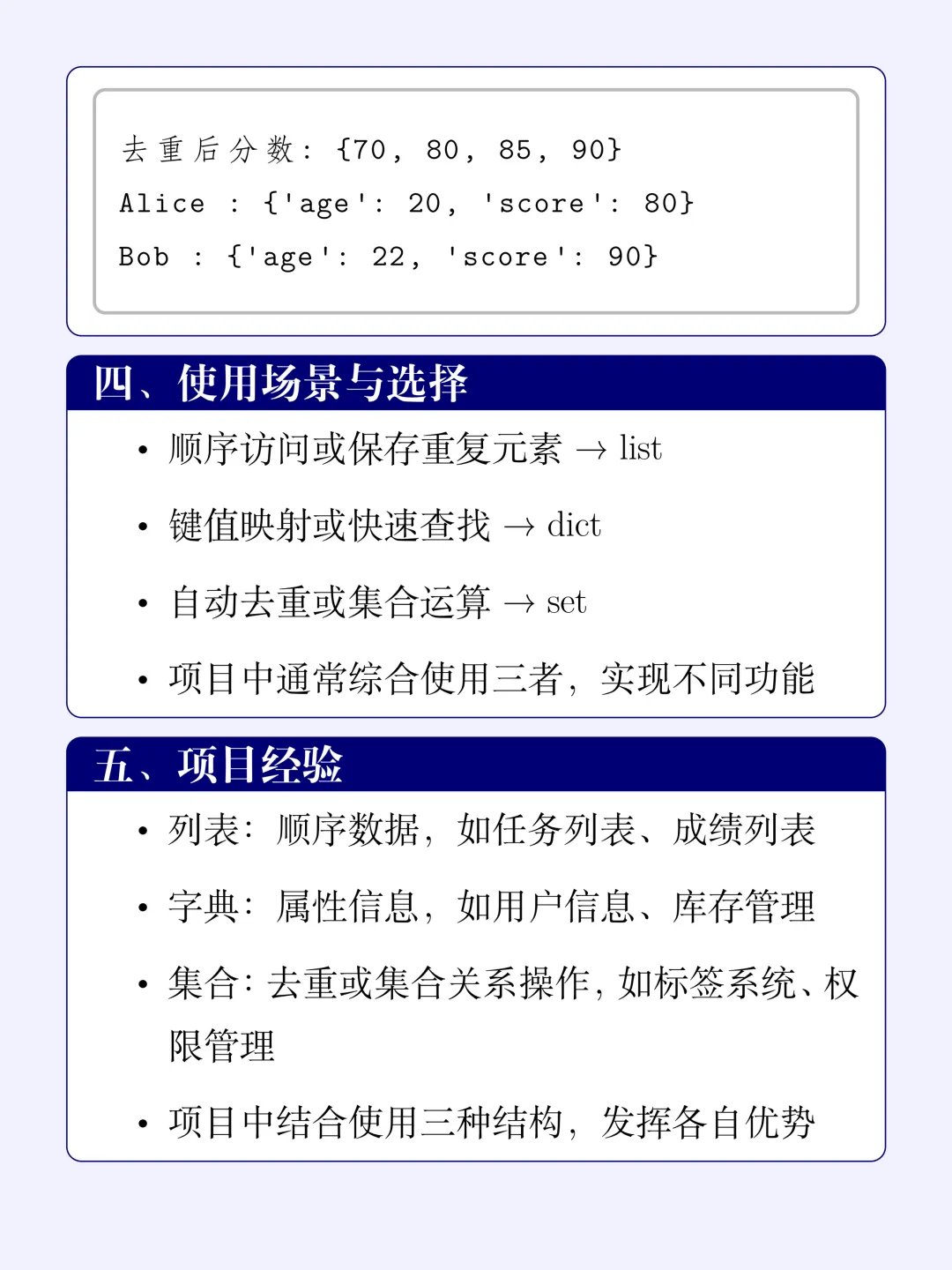 # 1. 列表 (List):按顺序记录最近几次的测验分数(允许重复)scores = [80, 90, 70, 85, 90]# 2. 集合 (Set):老板问“一共考出过几种不同的分数?”,用集合一秒去重unique_scores = set(scores)print("去重后分数:", unique_scores)# 3. 字典 (Dict):记录具体的学生个人档案(嵌套字典更强大)students = { "Alice": {"age": 20, "score": 80}, "Bob": {"age": 22, "score": 90}}# 组合技:遍历字典打印信息for name, info in students.items(): print(name, ":", info)