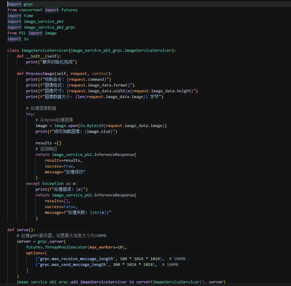 syntax = "proto3";package image_service;// 图像数据消息message ImageData {  bytes image = 1;  // 图像二进制数据  string format = 2;  // 图像格式,如jpeg、png等  int32 width = 3;  // 图像宽度  int32 height = 4;  // 图像高度}// 推理结果消息message DetectionResult {  string class_name = 1;  // 类别名称  float score = 2;  // 置信度得分  float x_min = 3;  // 边界框左上角x坐标  float y_min = 4;  // 边界框左上角y坐标  float x_max = 5;  // 边界框右下角x坐标  float y_max = 6;  // 边界框右下角y坐标}// 推理响应消息message InferenceResponse {  repeated DetectionResult results = 1;  // 推理结果列表  bool success = 2;  // 操作是否成功  string message = 3;  // 响应消息}// 命令请求消息message CommandRequest {  string command = 1;  // 命令类型  ImageData image_data = 2;  // 图像数据  map<string, string> parameters = 3;  // 可选参数}// 图像服务接口service ImageService {  // 处理命令和图像数据,返回推理结果  rpc ProcessImage(CommandRequest) returns (InferenceResponse);}