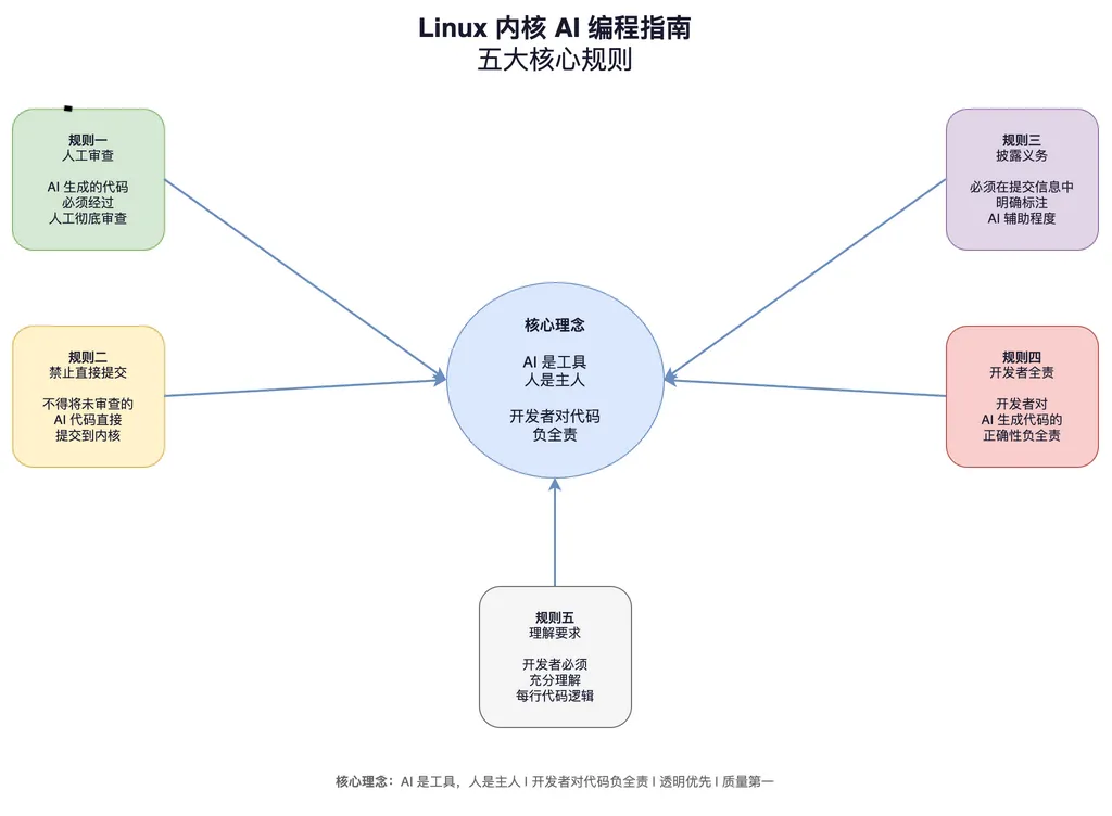 原文要求:任何借助 AI 辅助工具(包括代码生成、补全、审查类工具)产生的代码,在提交到内核之前,必须经过提交者本人彻底的人工审查。