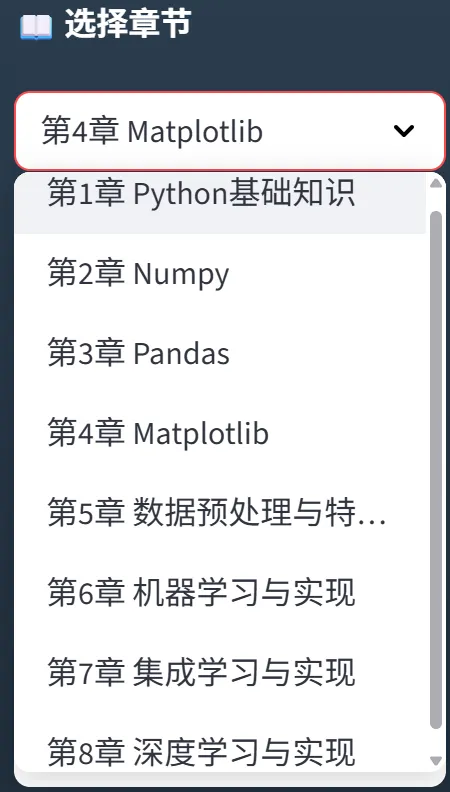 - 可视化联动化:针对 Matplotlib 章节,实现代码与图表的自动关联展示;