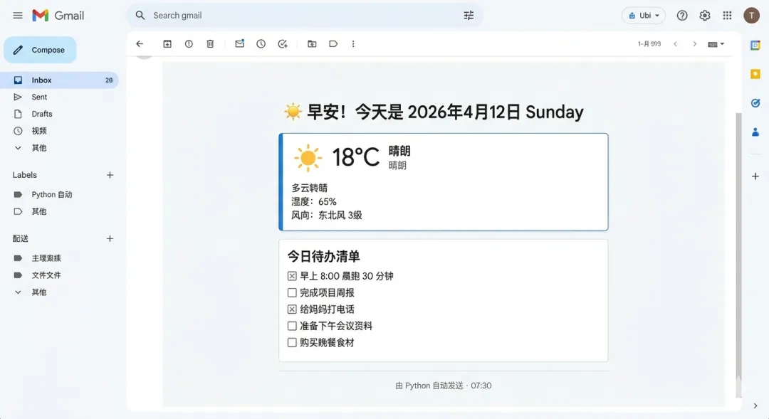 设想这样一个场景:每天早上 7:30,你的手机收到一封邮件,里面有今天的天气预报、你在 TODO 文件里写下的待办事项,以及一句每日一言。这封邮件完全不需要你动手,Python 在服务器上静静地运行,每天准时发送。