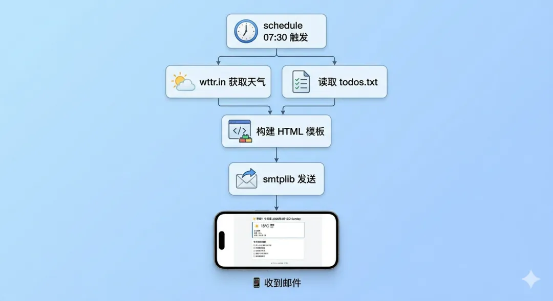 这篇文章把邮件发送、天气获取、定时调度三个能力组合起来,构建一个"每天早上自动推送天气+日程提醒"的自动化助手——从本地运行到部署上服务器,全程讲透。