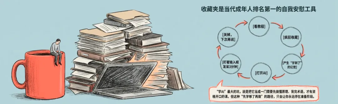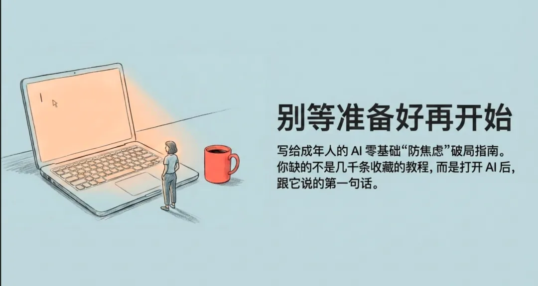 先看教程 → 收藏一堆 → 感觉自己学了很多 → 打开AI → 不知道问什么 → 盯着空白输入框发呆三分钟 → 关掉 → 过两天再打开 → 还是不知道问什么 → 算了下次再说。