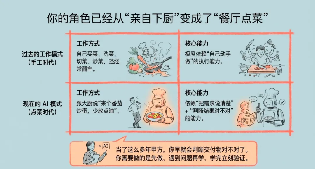所以核心能力变了。以前靠的是“自己动手做”的能力。现在靠的是“把需求说清楚 + 判断结果对不对”。