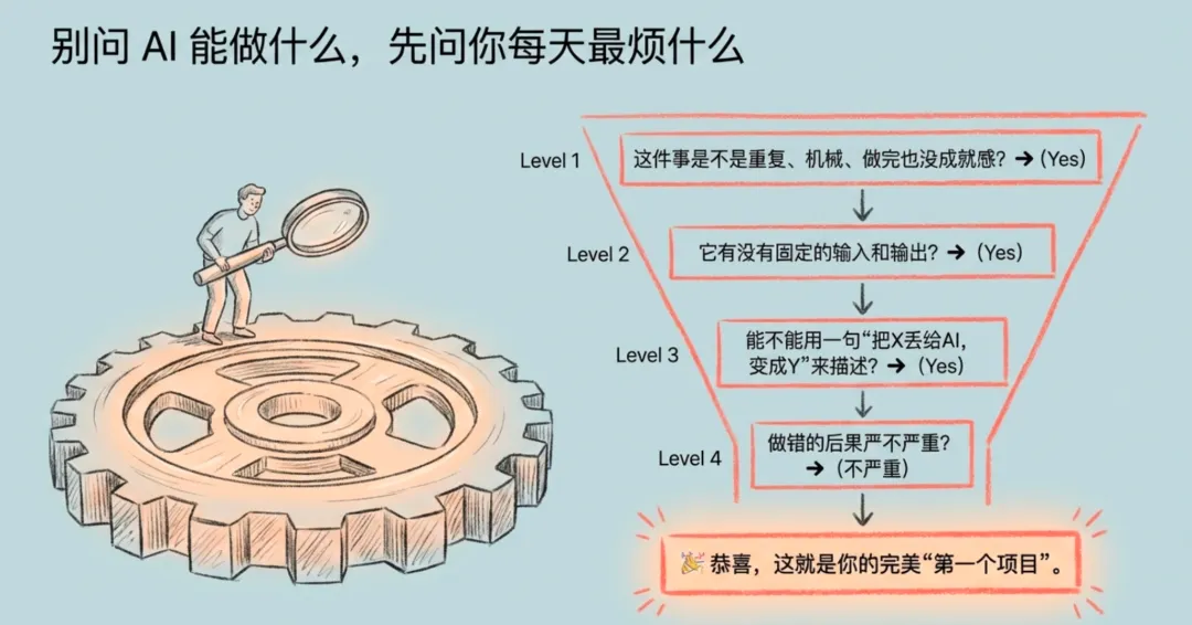 不要从“AI能做什么”开始。要从“你每天最烦什么”开始。