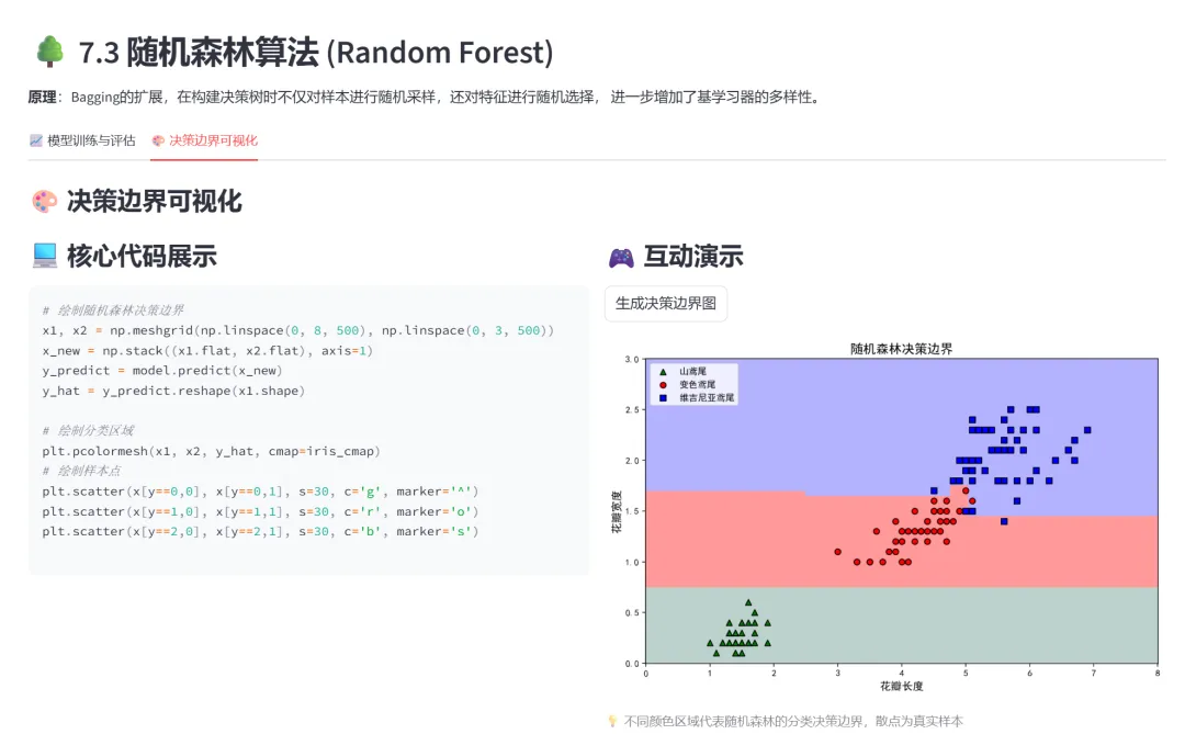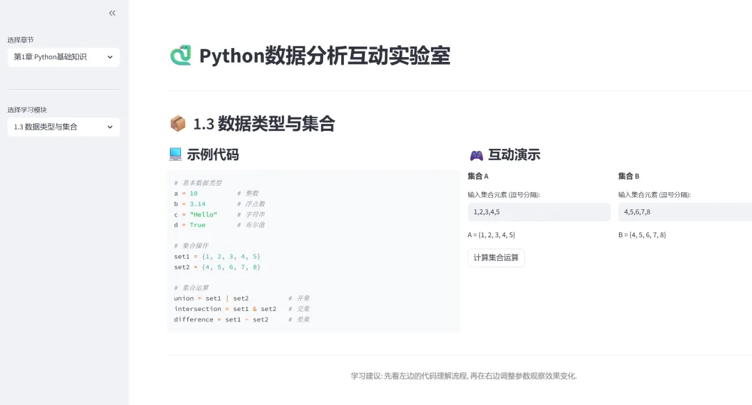 你是否曾经这样学习Python数据分析——打开一本厚厚的教材,对着代码一行行敲,却不知道结果为什么是这样;配置环境折腾半天,好不容易跑通一个例子,换个数据集又报错;想理解算法原理,看到的全是数学公式,越看越晕……如果有一个工具,能让你边调参数边看结果,左边是代码右边是演示,点击按钮就能看到决策边界变化,学习会不会变得更有趣?今天要介绍的这个开源项目——Python数据分析互动实验室,就是用Streamlit打造的一个完整教学工具,覆盖了从Python基础到集成学习的全部内容。